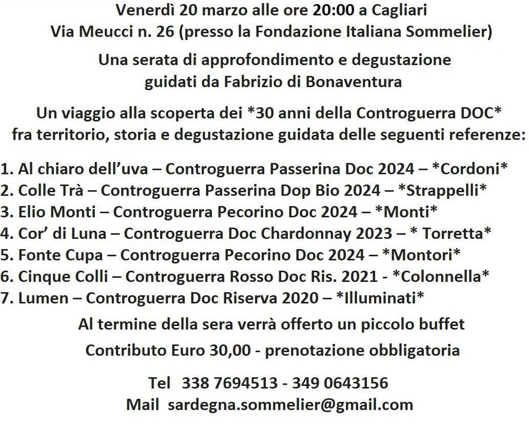 Venerdì 20 marzo alle ore 20:00 a Cagliari – Via Meucci n. 26 (presso la Fondazione Italiana Sommelier)